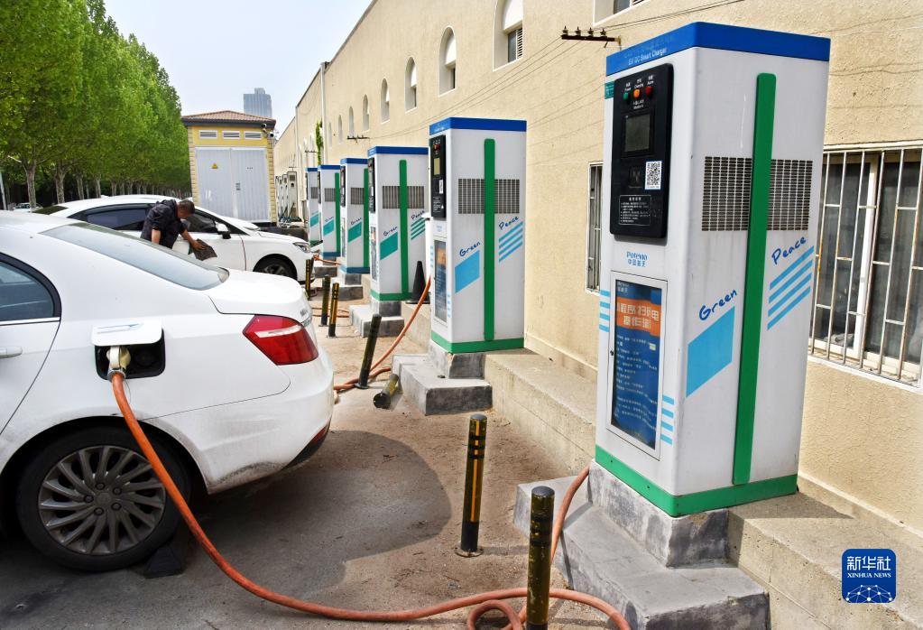 车主在青岛市市南区宁夏路一处公交车停车场的对外充电区,为自己的新能源轿车充电(5月11日摄)。