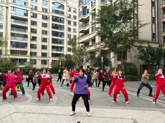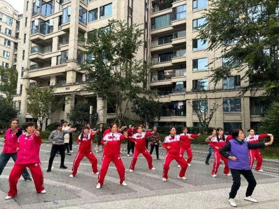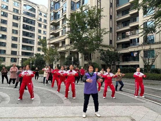 相较于中航城的热闹,蓝光领誉小区活动现场呈现出“动静结合”的雅致与活力。活动分上下半场,上半场为温馨的“重阳茶话会”,下半场是养生的“八段锦、太极拳习练”。茶话会环节,志愿者将水果、糕点、菊花茶一一奉上。大家围坐畅谈,企业志愿者主动坐在老人身边,倾听他们讲述过去的故事,分享当下生活点滴,现场气氛轻松愉悦。茶话会结束后,进入“动”的环节。小区中心花园里,在老师带领下,企业志愿者与老人一同学习八段锦和太极拳。蓝光舞韵瑜伽队志愿者认真练习,动作标准,还耐心帮助老人纠正姿势、讲解要领。“大爷,‘双手托天’动作再往上一点,感觉脊柱拉伸。”“阿姨,打太极拳要心静体松,节奏慢下来,呼吸跟上。”秋日暖阳下,老人舒缓伸展身体,志愿者青春身影穿梭其间,构成和谐动人画面。