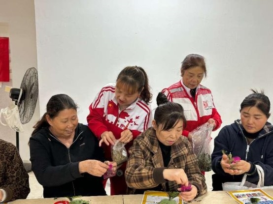 蓝光映玥小区的香囊手工活动则满馥郁香与巧思,同时还穿插了实用养生知识分享。活动伊始,企业志愿者将布料、艾草、丁香、藿香等中草药材料分发给老人。在手工老师指导下,蓝光舞韵瑜伽队志愿者协助老人填充药粉。现场弥漫着中草药清香,李奶奶拿着自己做的香囊,爱不释手:“这是我第一次做香囊,没想到这么成功!放在床头,晚上肯定能睡个好觉。”手工环节结束后,爱好养生的志愿者吕阿姨为老人带来简短实用的秋季养生知识分享。她从饮食调养、起居作息、情绪管理等方面,用通俗易懂的语言讲解秋季保健要点,并耐心解答疑问。老人听得津津有味,纷纷表示受益匪浅。