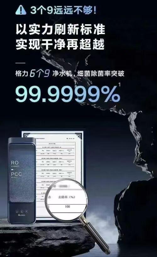 针对市场上净水机普遍存在的过滤系统最后一级为后置活性炭,可能残留炭颗粒或炭纤维、影响过滤效果的问题,格力2023年推出的“6个9”系列净水机,将细菌除菌率提升至99.9999%。该系列采用双膜过滤技术(RO膜+后置超滤膜),成功解决行业普遍存在的后置活性炭颗粒残留问题,实现总大肠菌群100%去除。