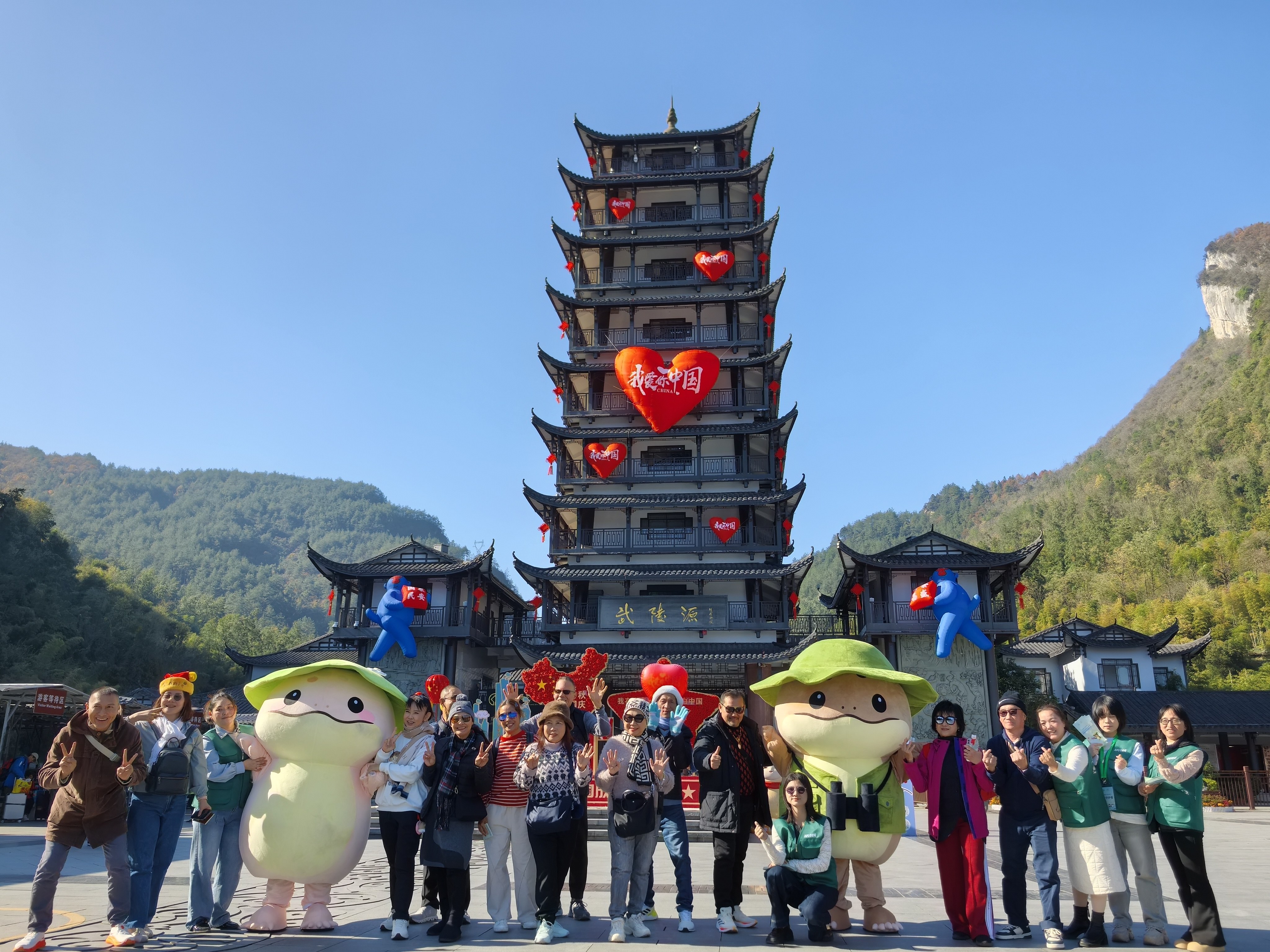 启动仪式后,“大鲵守护者”们赶赴张家界森林公园景区门口,开启了湖南张家界大鲵国家级自然保护区生物多样性保护科普宣教进“学区、景区、社区、渔区”四进活动。活动现场设置了大鲵科普展板、互动体验区,志愿者们向游客讲解大鲵的生态价值及保护意义,并通过趣味问答、生态拼图等形式增强参与感。尤其是志愿者们穿着吉祥物“鲵澧”和“鲵源”制作的人偶,穿梭在游客中间派发宣传资料,引来了很多中外游客争相合影留念,大家纷纷表示,愿意加入到保护大鲵、保护生态环境的队伍中来。
