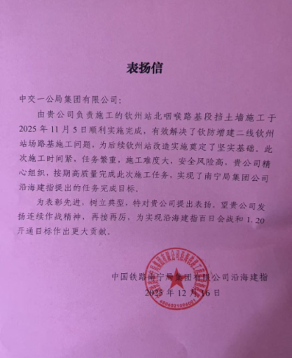 近日,中交一公局集团钦北线铁路桥改建工程项目在钦州站改造及相关工程中的出色表现,获得业主单位高度认可。中国铁路南宁局集团有限公司沿海铁路工程建设指挥部专门发出表扬信,对项目团队优质、安全、按期完成钦州站北咽喉路基段关键挡土墙施工任务予以表扬!