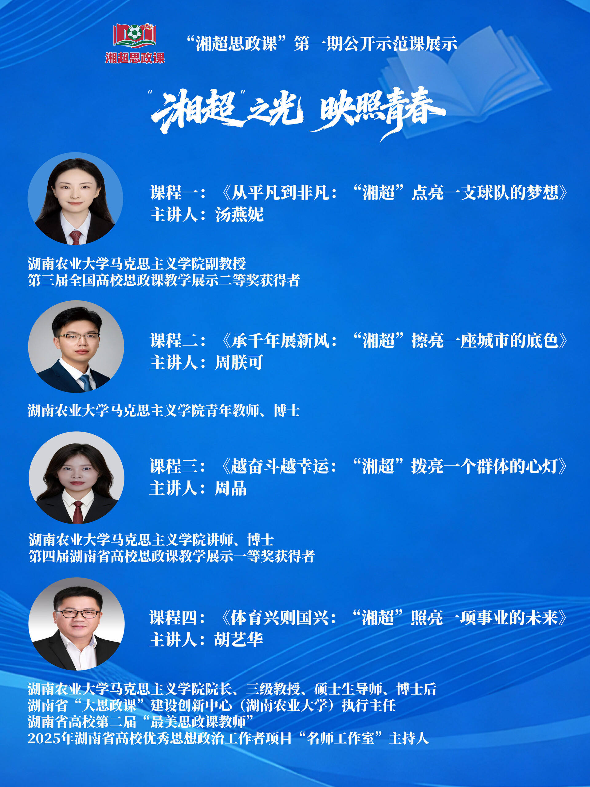 活动现场举行了“湘超思政课”共同体揭牌仪式,标志着由宣传部门、教育部门、高校、中小学、行业单位、媒体等多方共同参与的思政育人共同体正式成立。湖南省高校“最美思政课教师”、湖南农业大学马克思主义学院院长胡艺华教授领衔的专家团队,为现场师生呈现了四堂精彩生动的示范课:汤燕妮副教授以《从平凡到非凡:“湘超”点亮一支球队的梦想》诠释奋斗的价值;周朕可博士在《承千年展新风:“湘超”擦亮一座城市的底色》中梳理零陵文化脉络;周晶博士通过《越奋斗越幸运:“湘超”拨亮一个群体的心灯》讲述成长故事;胡艺华教授以《体育兴则国兴:“湘超”照亮一项事业的未来》解读时代使命。课程有机融合体育激情、音乐韵律与思政内涵,实现了思想性、感染力与时代感的统一。教育部高校思政课教学指导委员会委员渠长根教授作专业点评,湘超永州队主力队员与师生亲切互动,分享赛场拼搏的心路历程,现场气氛热烈,互动踊跃。