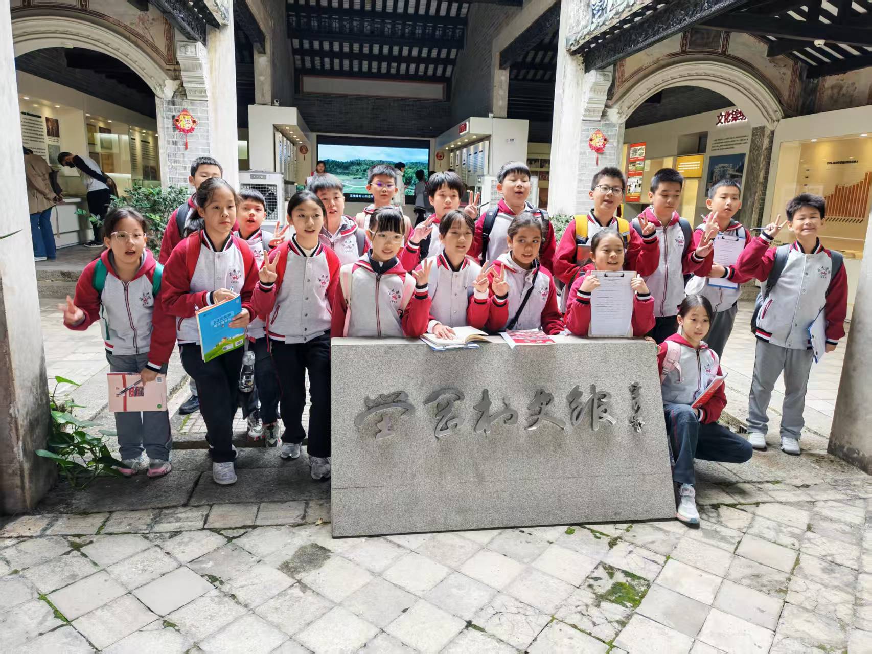 壆岗村史馆分为前厅图文展示区与后厅光影场景体验区,八大主题版块系统呈现了壆岗从明朝迁居至今的历史变迁、经济发展、文化传承与红色基因。对于为明学校三至六年级的学生而言,这里不是静态的展馆,而是可触摸、可探索的“活课堂”:“源远流长”版块的陈氏家谱与驸马楼故事,让学生们追溯到沙井地区的历史根脉;“文化锦绣”版块中足球之乡的拼搏精神、粤曲艺术的薪火相传,让他们感受到传统文化的鲜活生命力;“红色壆岗”版块的抗战故事,更让他们深刻体悟到家国情怀的厚重内涵。丰富的文化资源为学生们的项目式学习提供了坚实基础,让本土文化变得可感可知。