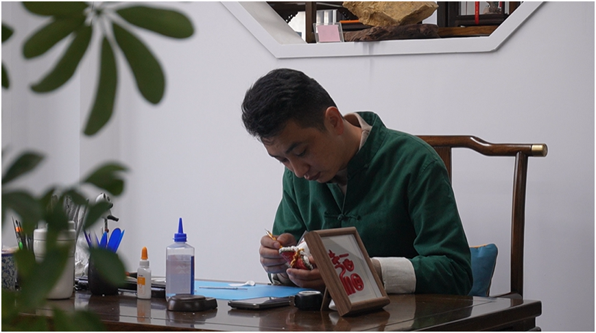走进李斌的面塑工作室,面团在他手中仿佛拥有了生命。揉、搓、捏、压、剪、刻,一系列动作行云流水,短短十几分钟,一个造型饱满的面塑“福”字便初见雏形。