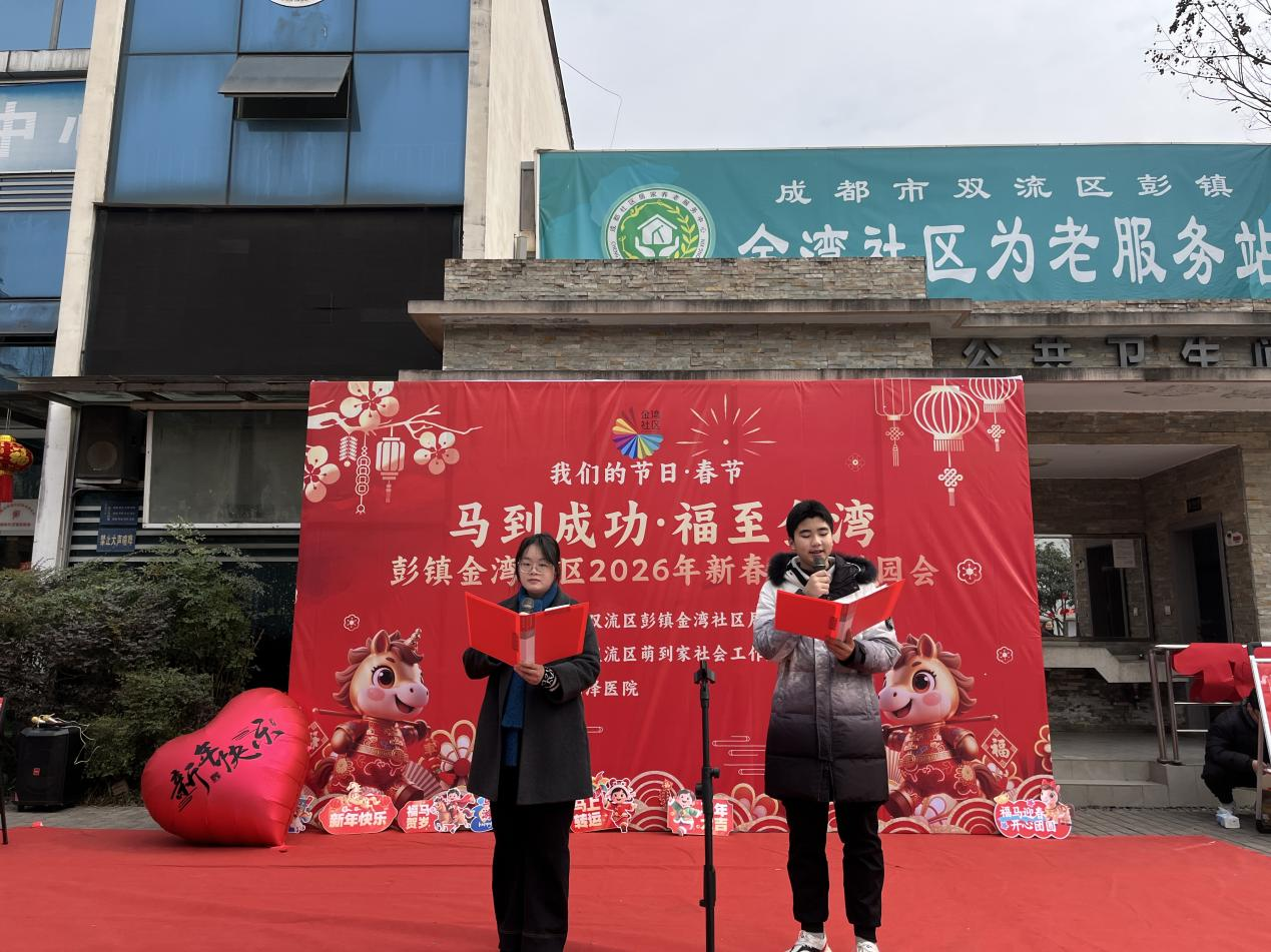 成都市双流区彭镇金湾社区党委副书记彭敏敏登台致辞,向全体居民致以最诚挚的新春祝福,祝愿大家在新的一年里阖家幸福、万事顺意、马到成功,简单真挚的话语赢得了现场居民的阵阵掌声。