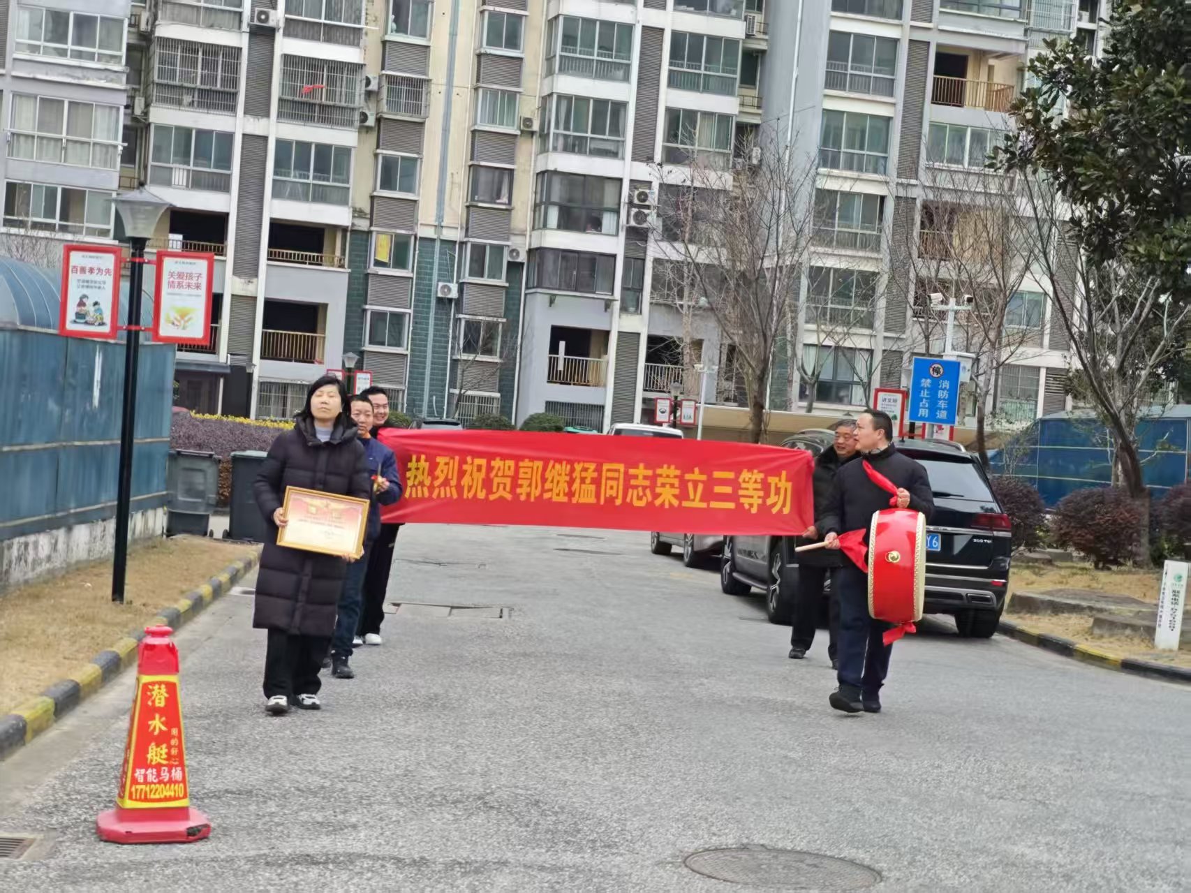 一行人首先来到小区门口,在喧天的锣鼓声中,大家拉起“热烈祝贺郭继猛同志荣立三等功”的横幅,一路步行前往郭继猛家中,让这份荣光随着鼓声传遍了整个社区。