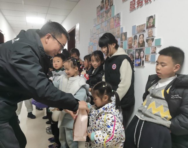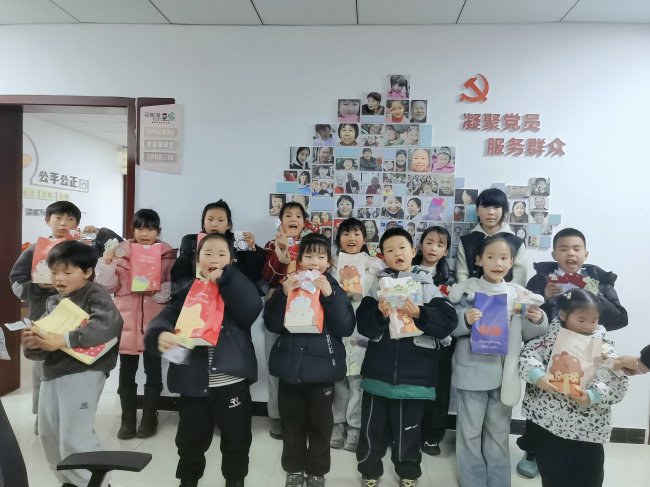 作品完成后,孩子们怀着喜悦的心情,手持自己的冰箱贴或提着亲手制作的灯笼,与社工、志愿者一同在展示区前合影留念。镜头下,红金相映的手作作品与孩子们灿烂的笑容相映成趣,满满年味与公益温情定格成最珍贵的瞬间。社工简要总结活动,重申作品的公益价值。随后,社区负责人蔡书记与社区唐主任亲自为孩子们分发精心准备的新年礼品,送上新春的美好祝福,感谢大家用创意为“慈善友邻”公益义卖助力。