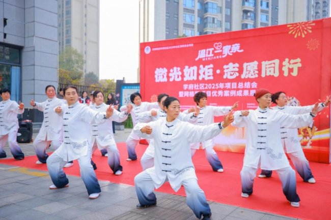 老年协会段会长、芳邻2期范林老师分别结合自身参与的“搭伙拼菜”“暖冬聚情·邻里同心”坝坝会等项目,分享了社区治理中的实践经验与暖心故事,生动展现了邻里互助、共建家园的浓厚氛围。随后,社区太极队带来了柔和舒缓的八段锦表演,展现了社区居民健康活力的精神风貌。