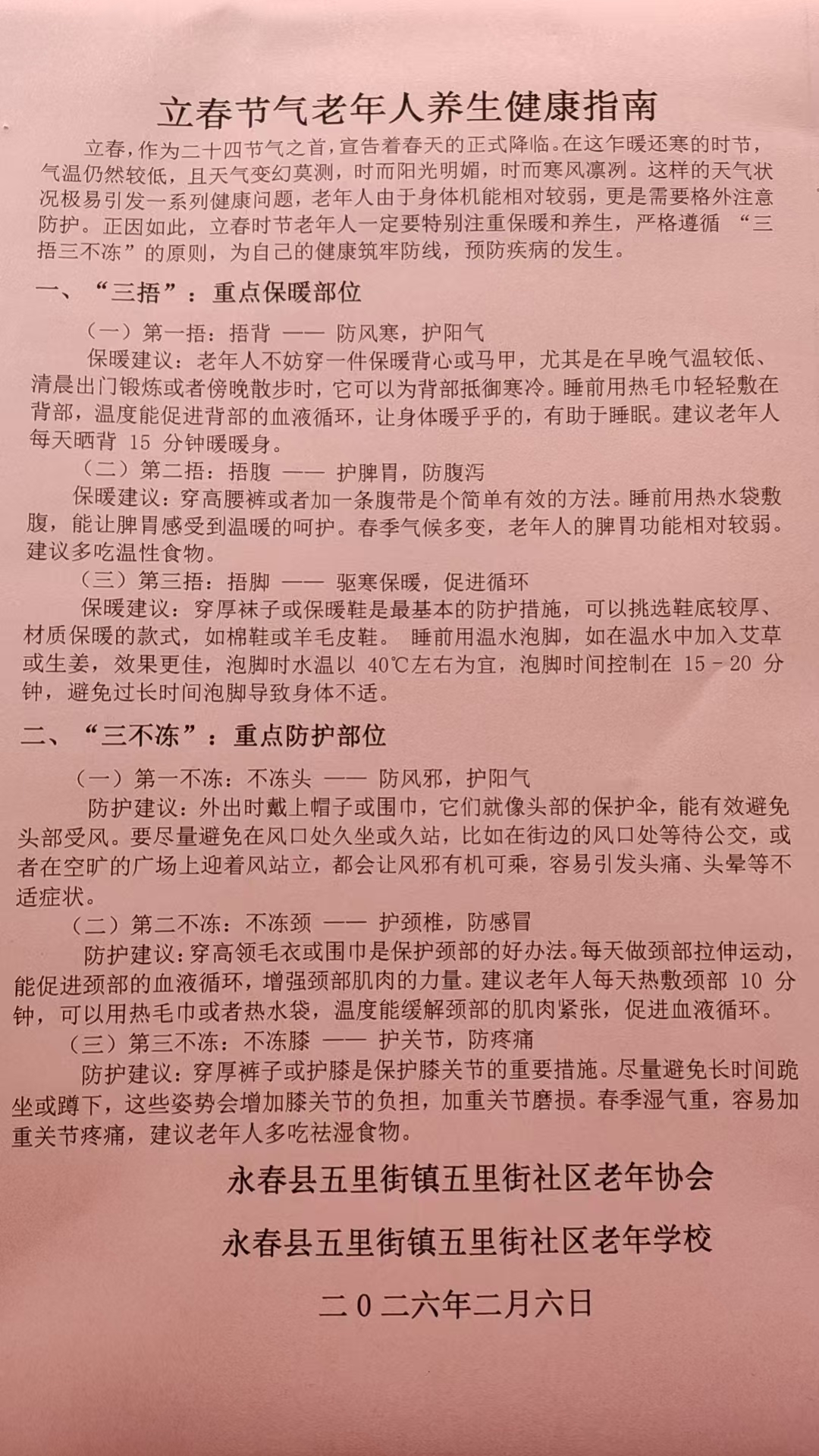 永春县五里街社区老年协会、社区老年学校编发的《立春节气老年人养生健康指南》。