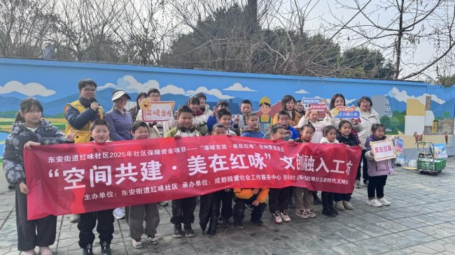 2026年2月4日,红咏社区联合成都颐爱社会工作服务中心,在惠民佳苑小区对面开展了“空间共建・美在红咏”文创融入工坊第三期。此次活动将社区历史变迁文化与墙绘进行深度融合,形成社区特色的文创作品。活动吸引了社区儿童、青少年和家长共同参加本次文创融入工坊。