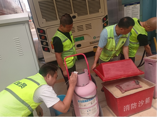 检查组一行深入场站重点区域,对车辆停放区、维修车间、充电桩设施、办公区域、仓库及围墙护坡等关键部位进行了细致检查。排查内容涵盖排水系统是否通畅、防汛物资是否完备、消防器材是否有效、用电用气是否规范、应急设备是否齐全等,确保不留盲区、不走过场。