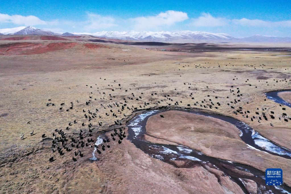 4月19日,在青海省玉树藏族自治州曲麻莱县,牦牛在草原上觅食(无人机照片)。