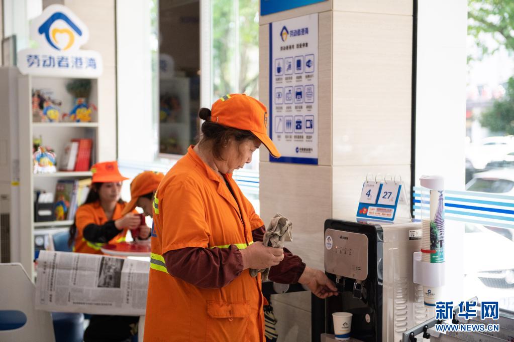4月27日,在建行常德市分行营业部“劳动者港湾”,环卫工人在接水。