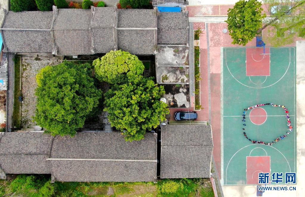 4月6日,在河南省信阳市新县箭厂河乡,箭厂河列宁小学学生在上体育课(无人机照片)。
