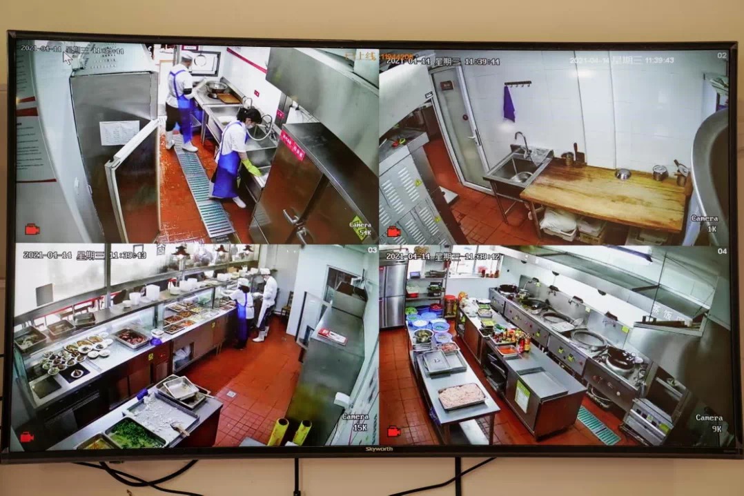 “明厨亮灶”由四个小屏幕组成,分别是洗菜区、切配区、灶台区和分餐区。身穿白衣的分餐员井然有序地盛菜,后厨整洁明亮。家属说,“老人的一日三餐都在食堂后厨中制作,老人在楼上用餐,我们家属就在下面看大屏幕。卫不卫生、规不规范,我们都清楚得很。”解决了后厨不能进人,食品安全无从知晓的问题。目前,虹口区设有食堂的养老机构后厨内都已安装了视频监控设备。住养老人及家属能够在用餐场所实时看到厨房加工制作的全过程。