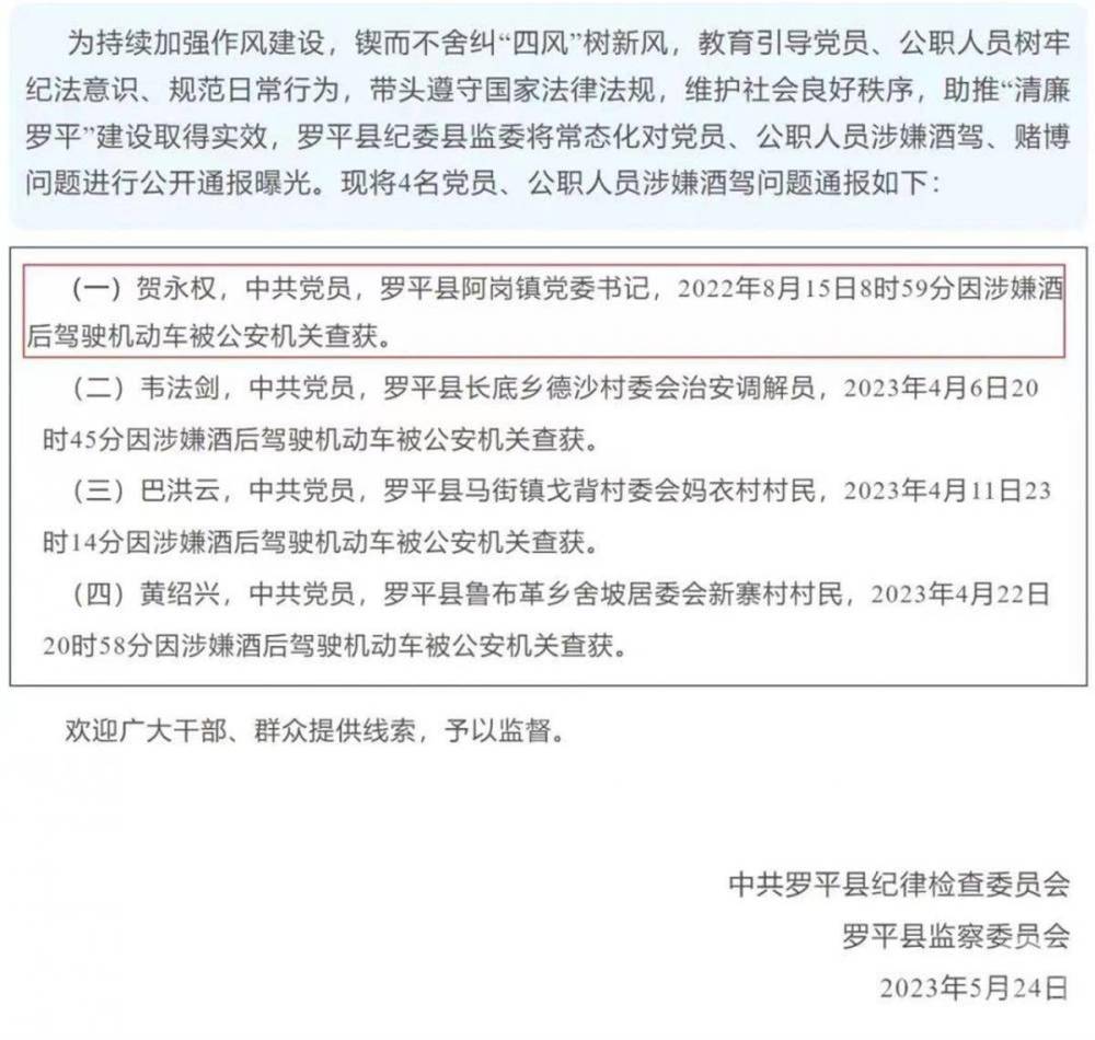 5月24日,罗平县纪委监委通报贺永权酒驾违纪事件(图源:罗平县纪委监委)