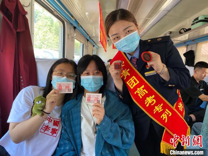6月6日,高考专列上的列车员和考生互动,帮助他们解压。