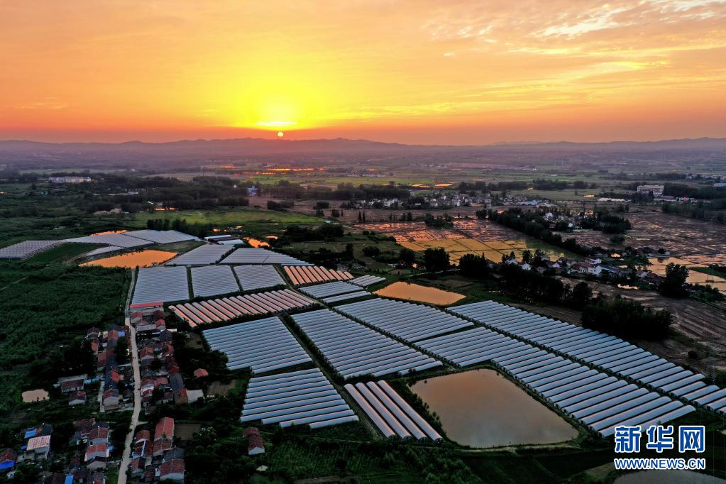 晚霞映衬下的安徽省全椒县六镇镇大张村金蝉芦笋种养基地(6月21日摄,无人机照片)。