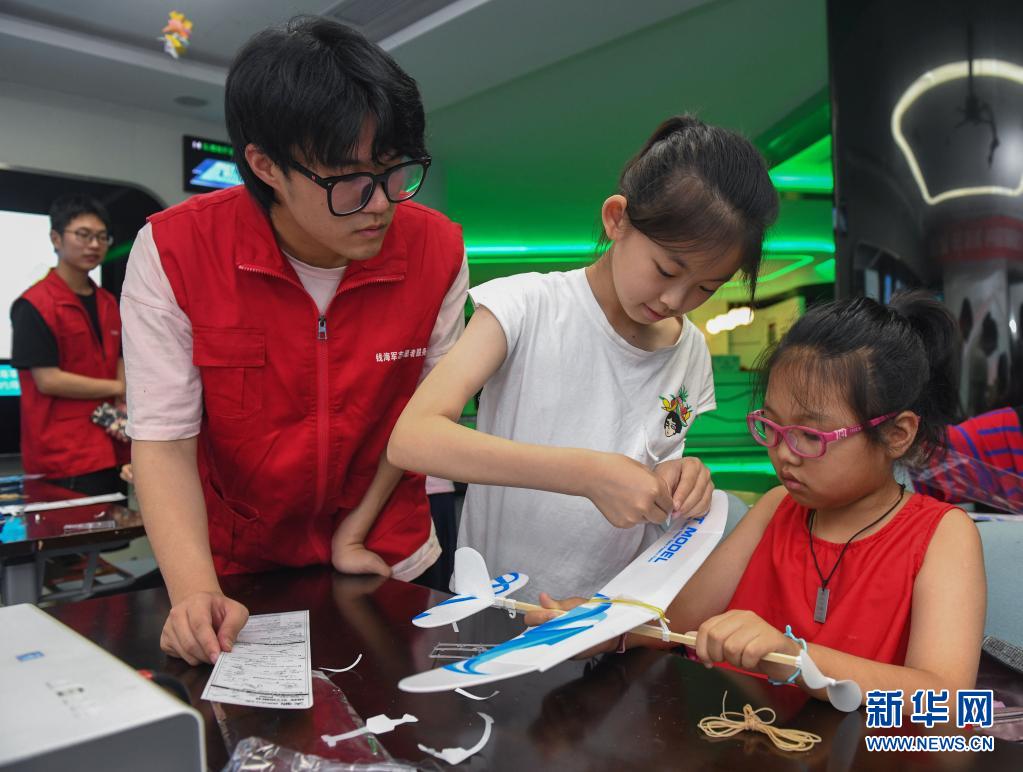 7月8日,学生在志愿者的帮助下制作动力飞机模型。