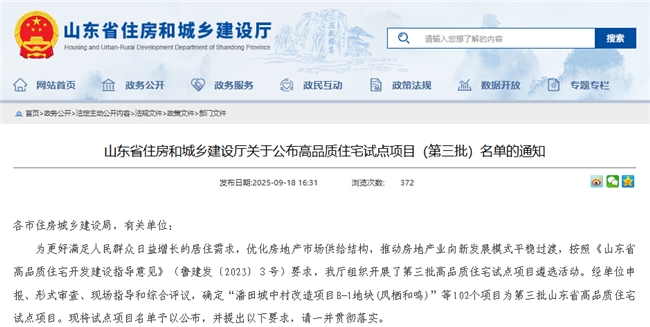 近期,山东省住房和城乡建设厅印发《关于公布高品质住宅试点项目(第三批)的通知》,泰安市4个项目入选,泰山区独占3个项目,分别是:泰山人家、君悦・时代麓城、新华・御湖庄园观湖及知湖组团。截至目前,泰山区已累计培育5个省级高品质住宅项目,项目数量稳居全市首位。