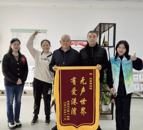 感受到关怀的他,以更加饱满的热情投入志愿服务:在为多重残疾居民安装农作物防护提示牌时,他通过手势与社工默契配合,精准固定提示牌位置,为居民的生计安全筑起“防护墙”;在重阳佳节为高龄独居老人安装紧急呼叫报警器时,他耐心调整设备高度,用无声的行动传递关怀。而这份双向的温暖,也迎来感人的回馈——老人的子女专程到社区送来印有“无声世界,有爱港湾”的锦旗。“不仅给予了我父亲生活上的关心,更让他找到了生活的意义,我们为他骄傲!”子女的感激之言,正是社区“助人自助”理念的生动印证。