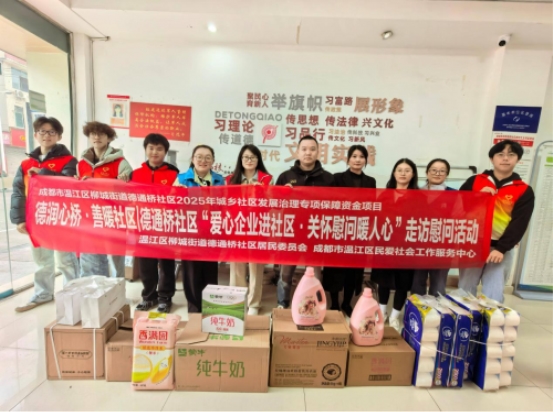 冬季将至,温暖先行。为弘扬中华民族敬老爱老的传统美德,营造尊老敬老的良好社会风尚,进一步增强辖区企业的社会责任感,近期德通桥社区携手爱心企业温江区乐乐幼儿园、奥斯顿幼儿园、壹高艺体培训学校、泸州老窖怀旧酒类营销有限公司、温江区民爱社工共同发起了一场温暖而有力量的联合慰问活动,为辖区20户特殊群体送去大米、牛奶、抽纸、洗衣液等慰问物品,用实际行动筑牢民生幸福防线。