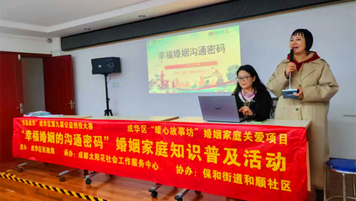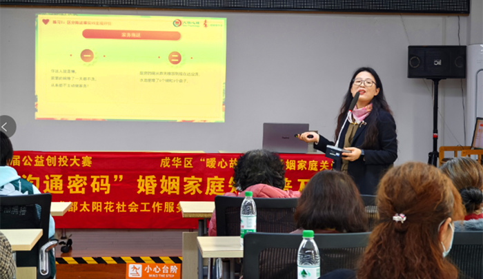 为帮助社区居民建立健康的婚姻家庭观念,提升亲密关系经营能力,营造和谐稳定的社区氛围,2025年11月13日下午,由成华区民政局主办、成都太阳花社会工作服务中心承办、保和街道和顺社区协办的社区婚姻家庭知识普及讲座,在和顺社区三楼会议室成功举办。本次活动特邀四川师范大学调解研究院心理专家、国家二级心理咨询师滕晓老师主讲,吸引了众多社区居民参与,活动现场气氛热烈,互动频繁,取得了良好的普及效果。
