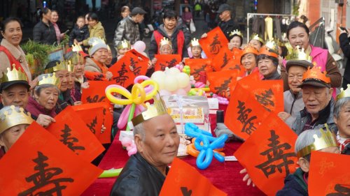 才艺展示环节为生日会增添了不少亮色,部分寿星主动献唱,悠扬的歌声赢得阵阵掌声;“领航红”老党员工作室的党员志愿者更是亲笔书写了一幅大大的 “寿” 字,笔墨间饱含对所有寿星 “福如东海,寿比南山” 的美好祝愿,将传统文化与敬老情韵完美融合。