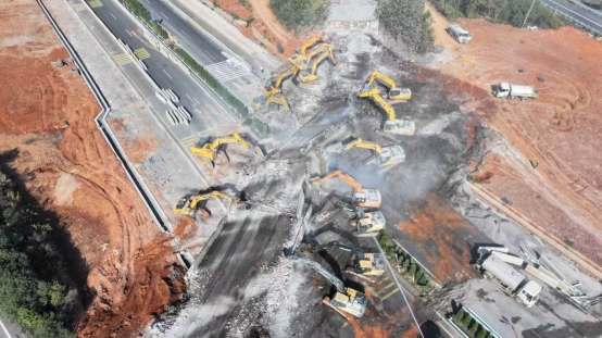 由中交一公局集团承建的昌金改扩建SSZ1标项目跨越樟树市和新余市,全长46.518公里,标段内共需拆除的老桥38座,拆除混凝土总方量达4.77万方。此次拆除的桥梁为本标段最后一座老桥——樟树枢纽B匝道桥,该桥上部结构采用20+3×30+20m预应力砼现浇箱梁,桥梁全长137.16m,拆除钢筋混凝土方量达1951方,累计投入20余台机械设备,仅12小时完成上跨樟吉高速主线段拆除作业,24小时内完成解封通车。