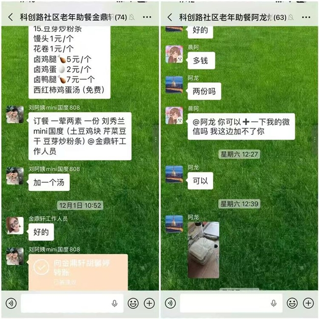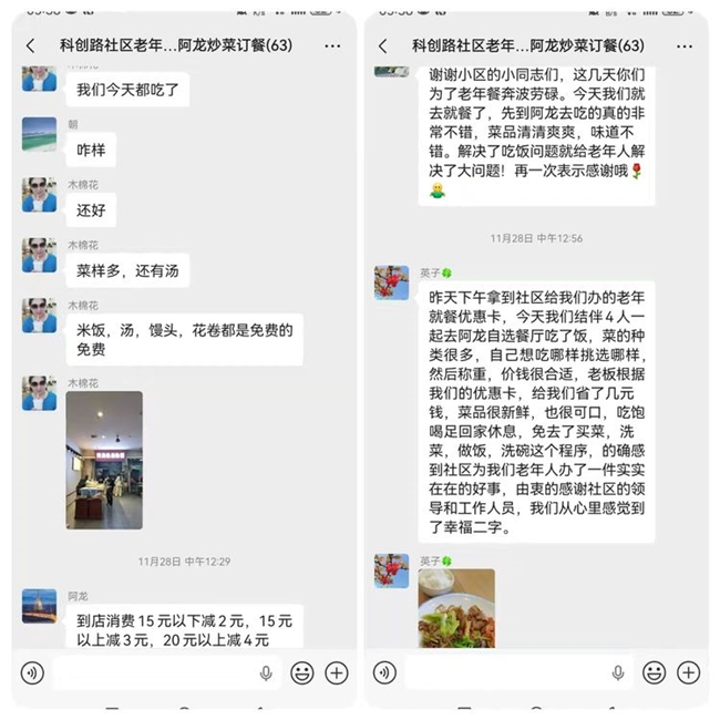 社区建立专属的“老年助餐服务群”。每天,各商户在群里发布当日菜单;老人们或家属可便捷下单;志愿者按片区、时段统筹配送,形成高效闭环。对于行动特别困难的老人,志愿者坚持每日“送餐上门”。