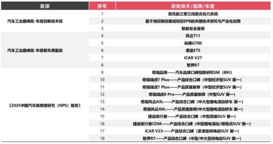 用户口碑是检验品质的最佳证明。根据大会期间权威发布的《2025中国汽车推荐度研究(NPS)报告》,奇瑞品牌在竞争激烈的燃油车市场,荣登“汽车品牌口碑指数研究SM(BRI)”榜首。此外,风云A9L、瑞虎7 Plus在各自细分市场包揽“产品综合口碑第一”“产品质量推荐第一”;奇瑞瑞虎8 Pro、捷途旅行者、捷途旅行者C-DM、iCAR V23和智界R7也在细分市场荣获“产品综合口碑第一”。获奖车型贯穿多技术路线、覆盖多元车型、多细分市场。