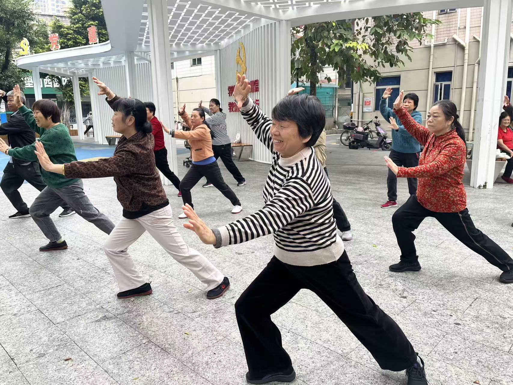 为丰富社区长者的精神文化生活,助力其身心健康与社会融入,在沙井社区党委的指导下,宝安慧家驻沙井社区党群服务中心的社工携手社区志愿者,于2025年12月1日至26日期间,在沙壆党建广场顺利开展了“乐学太极 共享健康”长者太极健身常规活动。活动以系统性、持续性的太极教学为主线,致力于为社区长者搭建一个社交支持与日常锻炼为一体的综合服务平台,累计吸引50岁以上长者240人次参与。