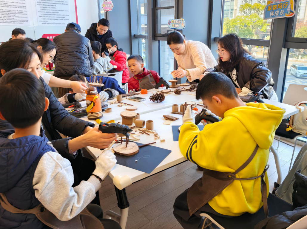 手工实践环节将活动推向高潮。现场材料区陈列着圆盘底座、树枝、木板、纸芯筒等基础材料,以及松果、树皮、彩色麻绳、丙烯马克笔等装饰用品,宛如微型自然博物馆。在老师演示工具安全使用方法后,亲子家庭分工协作,家长或提供技术支持,或参与创意讨论,或耐心指导操作,孩子们则从最初的小心翼翼逐渐变得熟练自信。