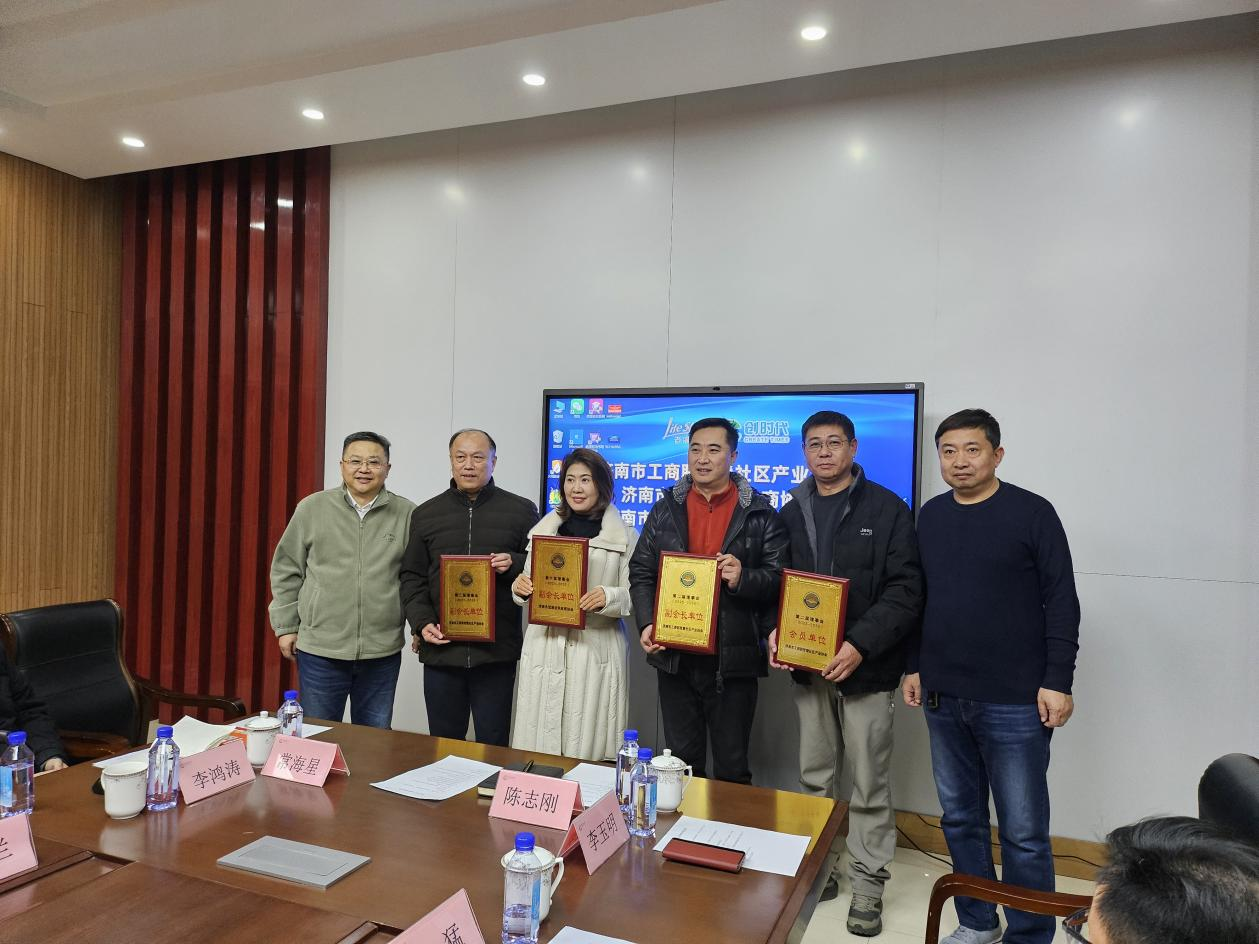 孙武虎副主席、韩刚会长为新入会单位:济南斟酒电子商贸有限公司、济南华彩众诚健康科技有限公司、山东创时代生物工程有限公司、山东秦老太食品有限公司授牌。