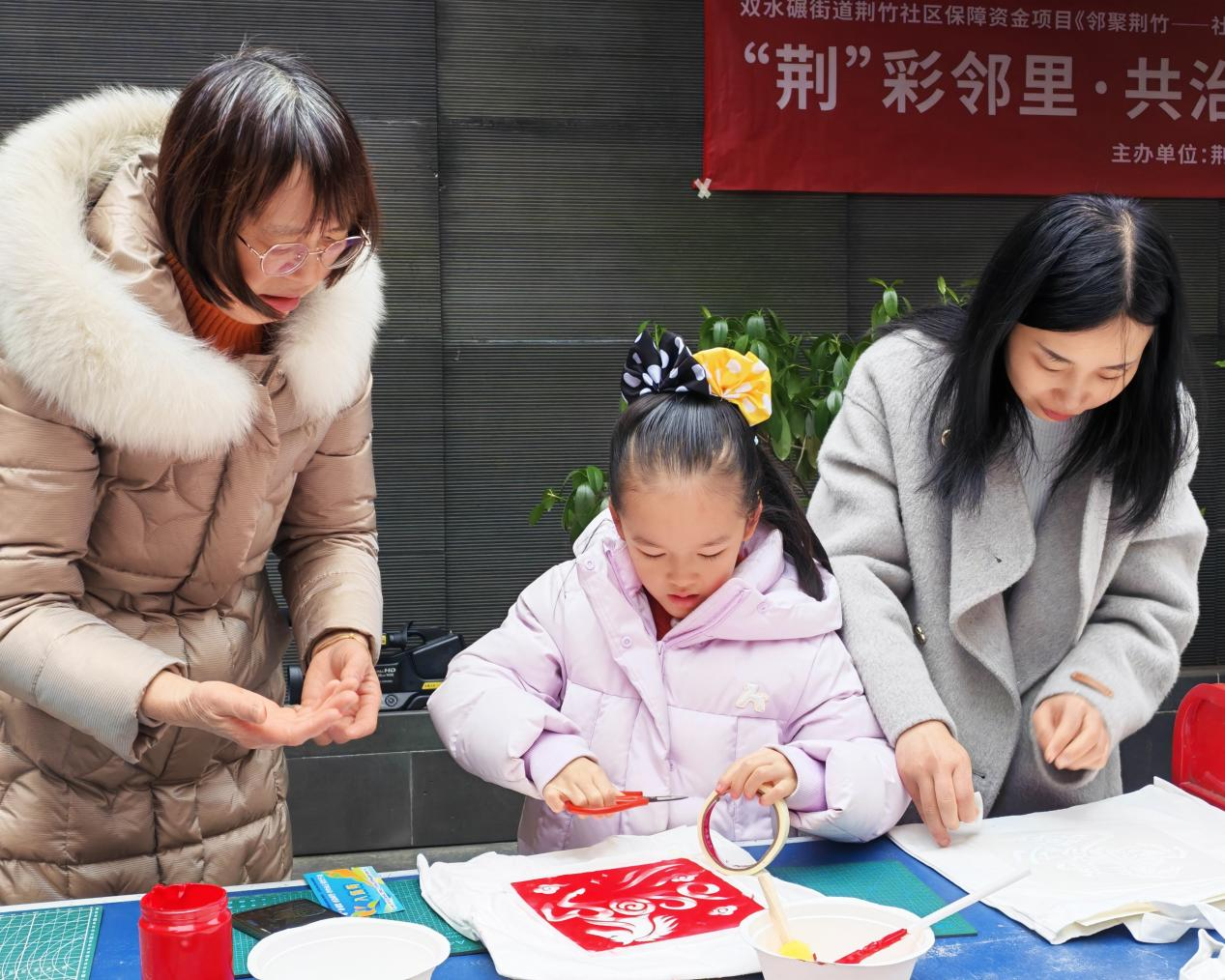 现场设置了邻里初见、协作挑战、巧手创艺、信义小课堂等六大特色环节,居民们手持“荆彩邻里打卡券”,在各个区域沉浸式体验。邻里初见区的主题背景墙前,陌生邻居结伴合影,让社区温情持续传递;不倒森林、同心运球等协作挑战项目中,老少携手、邻里同心,在欢声笑语中培养默契,凝聚起守望相助的邻里情谊;巧手创艺区里,红纸在指尖翻飞成精巧剪纸,空白帆布包被绘上多彩图案,居民们用创意表达对生活的热爱,也收获了亲手制作的专属纪念品。