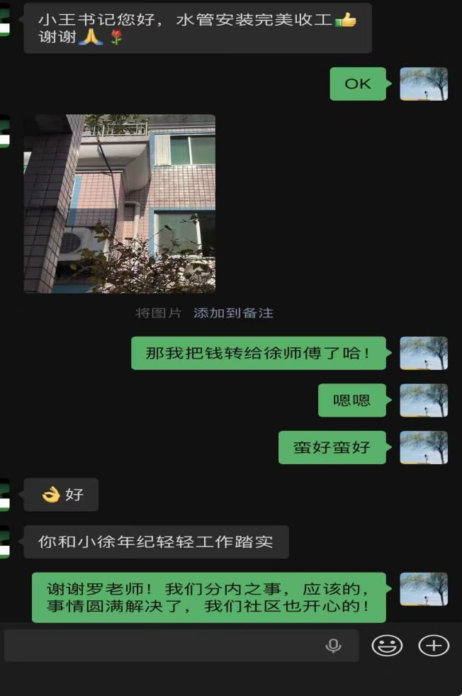 之后,网格员全程跟进施工,协助专业师傅按照协商好的方案重新安装了太阳能水管。经过规范施工,水管顺利安装到位,既不影响正常使用,也为罗大伯家雨棚安装留出了足够空间,彻底解决了两户人家的烦心事。居民罗大伯还通过微信向社区工作人员表达感谢,并为水管安装的圆满收尾点赞。