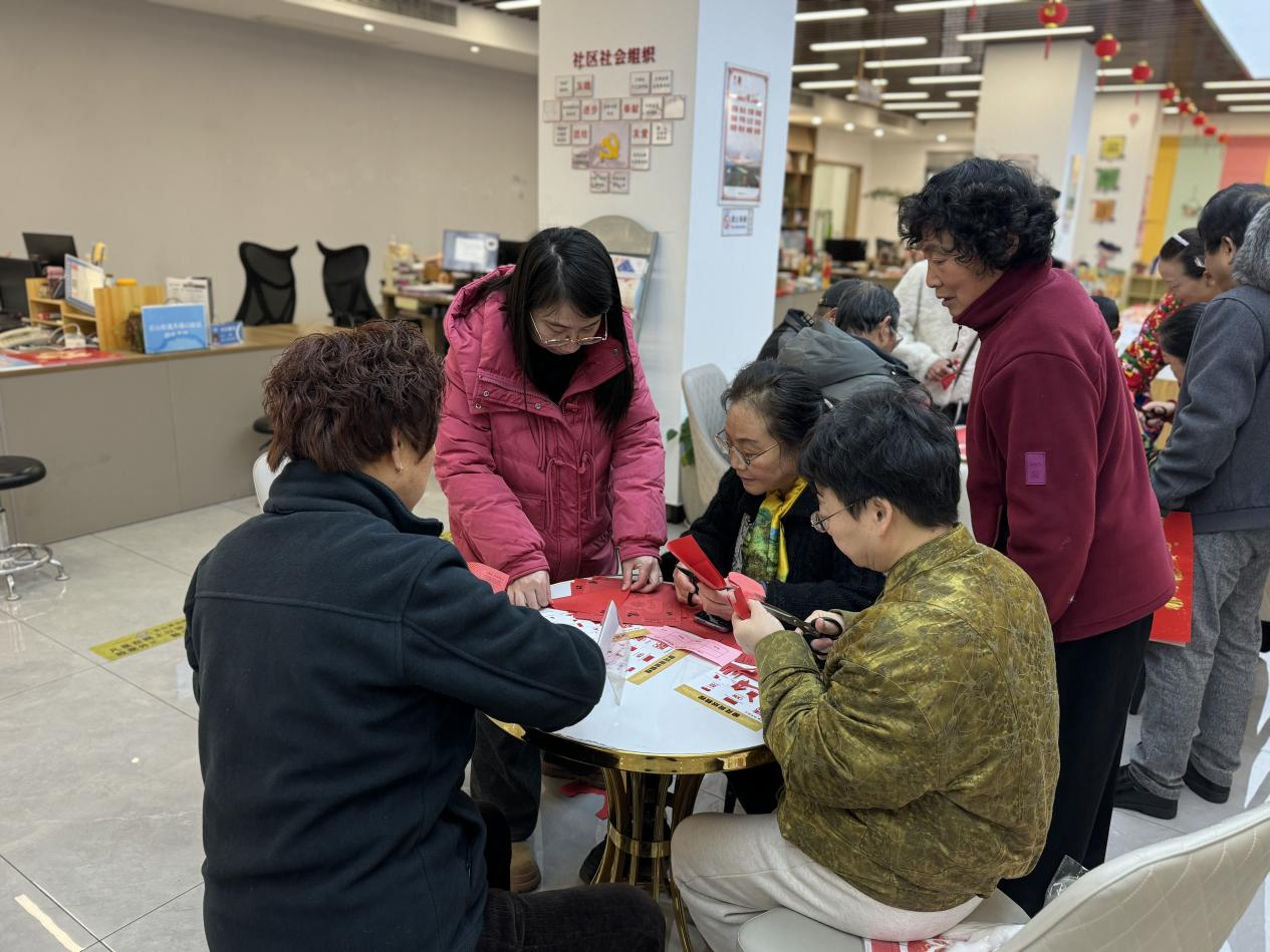 手工民俗体验区同样人气满满,拓印和剪纸摊位前围满了好奇的居民。在社区工作人员的耐心指导下,大家拿着拓印工具,将寓意美好的图案印在宣纸上;大家手持剪刀,指尖上下翻飞,红纸在剪刀的雕琢下化作兔子、福字、等独特作品。一张张精美的手工作品,承载着居民们对新一年的美好期许。