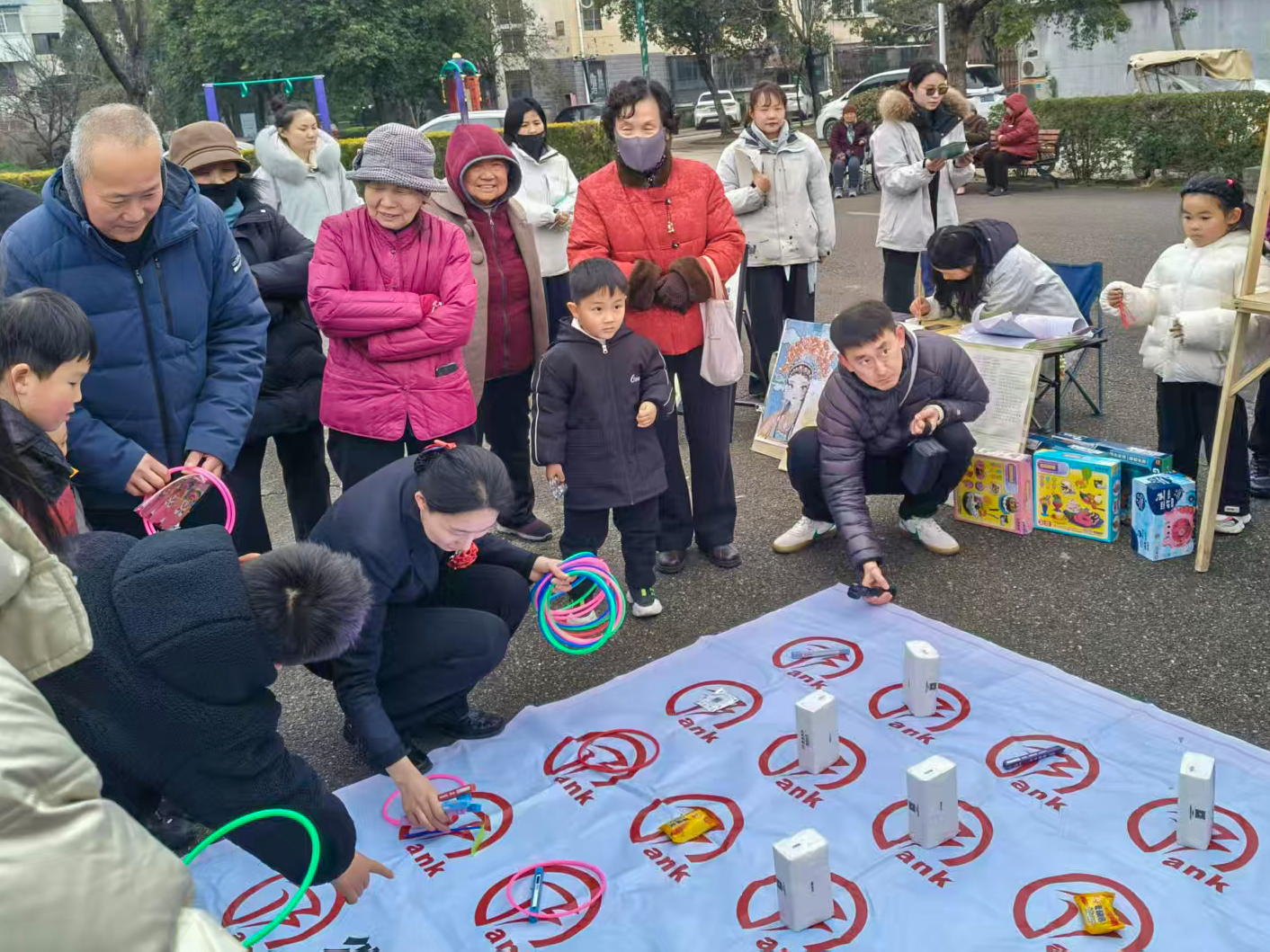 在套圈趣味游戏区,居民们排起长队,手持套圈,瞄准目标,精准投掷。成功套中奖品的居民欢呼雀跃,未套中的也不气馁,继续尝试,现场掌声、笑声、加油声此起彼伏,其乐融融。