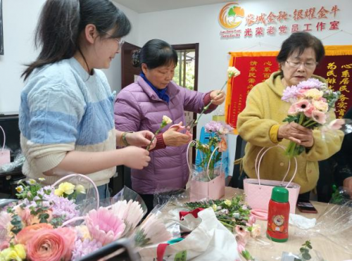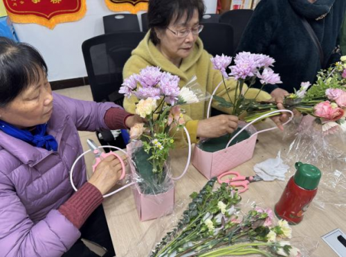讲座结束后,活动进入花艺创作环节。花艺老师首先为大家介绍了“三八”国际妇女节的由来与意义,带领大家回顾了这一节日背后所承载的女性奋斗与成就。随后,老师详细讲解了插花的基本技巧,包括花材的选择、色彩的搭配、造型的设计等,并现场演示了如何制作一个层次丰富、富有美感的插花作品。在老师的指导下,居民们纷纷动手实践,挑选自己喜欢的花材,认真修剪、搭配、布局,沉浸在花艺创作的美好时光中。现场花香四溢,笑语不断,大家在创作中放松了身心,也提升了审美情趣与动手能力。