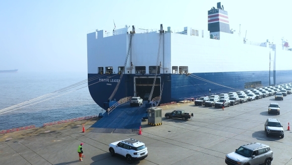图为奇瑞出口车辆即将登船出海