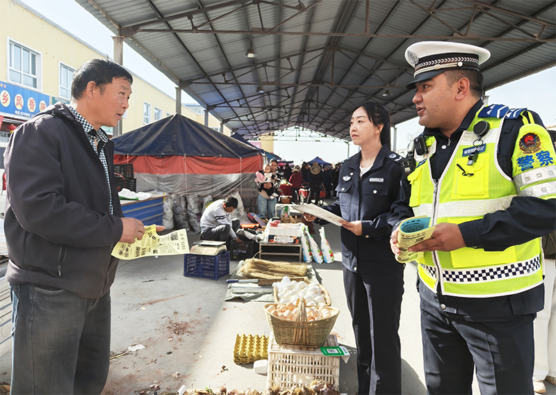 春季农忙时节,职工群众农事作业与出行需求激增,道路交通安全风险隐患随之上升。为深入贯彻落实道路交通安全综合治理要求,从源头预防和减少道路交通事故,切实以法治力量守护群众春耕生产和出行安全。4月7日,新疆生产建设兵团第五师八十四团司法所联合博乐垦区公安局交警大队、八十四团平安法治建设办、综治中心、社区等部门,以赶集日为契机,走进集市开展《中华人民共和国道路交通安全法》宣传活动,将行车安全知识与交通法律法规精准送到群众身边,为构建良好交通环境注入法治力量。