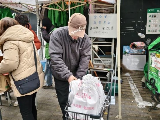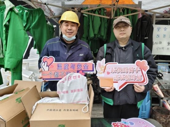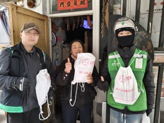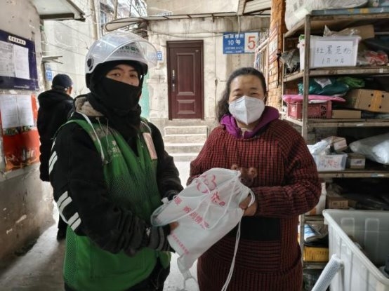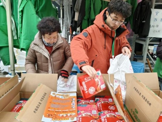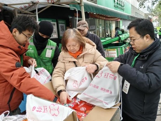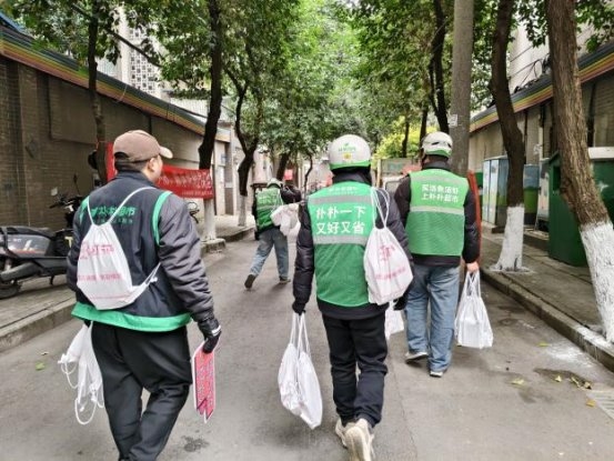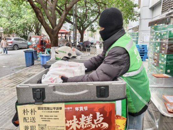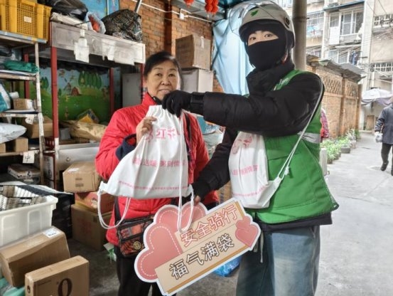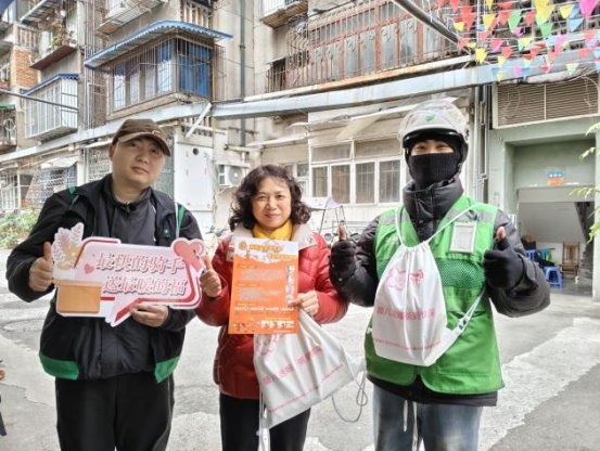 活动当日,在预先设定的朴朴超市服务点位,“红骑先锋”的骑手志愿者与居民志愿者代表早早汇聚一堂,默契协作,将一份份寓意吉祥的腊八米与精心制作的消防安全提示卡细心分装成袋。这些物资不仅承载着节日的温情,更寄托着社区对居民平安健康的深切关怀。准备工作就绪后,这支由企业骑手与社区居民组成的联合服务队伍,充分发挥“红骑先锋”熟悉社区脉络、行动敏捷迅速的优势,化身为温暖的“输送员”,穿梭于各个居民院落之间。