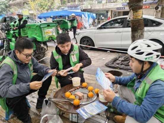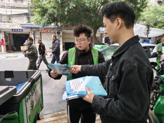 公益宣传阶段干货满满,骑手们结合日常配送中发现的居民安全隐患,提出需要重点普及的反诈、安全知识,并精心制作了图文并茂的宣传手册。随后,骑手们化身公益宣传员,在社区内进行广泛分发。他们利用自己熟悉社区的优势,精准地将宣传单送到居民手中,并耐心地为居民讲解反诈和安全知识。遇这一行动不仅增强了居民的安全意识,也让骑手们感受到了自己为社区做出的贡献,进一步提升了他们的归属感和责任感。