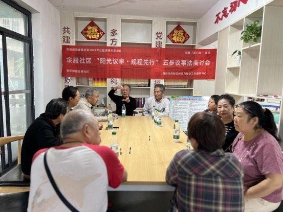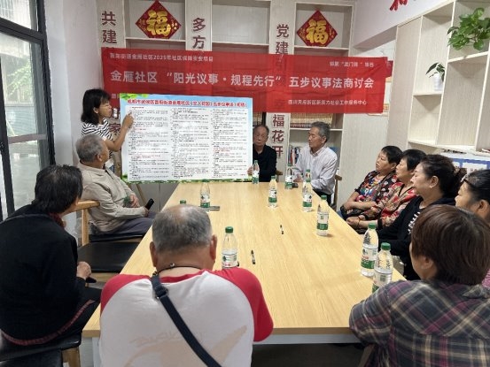 为明确“五步议事法”(议题征集—公示酝酿—协商表决—执行监督—反馈公示)的具体流程,进一步提升小区议事规范性和有效性,2025年9月27日上午,金雁社区携手四川天府新区新质力社会工作服务中心,在交大花园党群活动室联合开展“阳光议事・规程先行”五步议事法商讨会,业委会、议事会、党支部成员及热心居民共11人共同参与。活动以规范小区议事流程、提升治理效能为核心目标,开场阶段由新质力社工详细阐明活动意义,同时结合前期梳理形成的《阳光议事规程》框架,向参会人员讲解议事工作的基础方向与核心思路;随后,社工引导大家围绕交大花园当前议事过程中存在的议题征集不全面、公示不及时、执行监督不到位等实际问题展开深入交流,通过案例分享与需求分析,进一步明确梳理“五步议事法”的紧迫性与必要性。