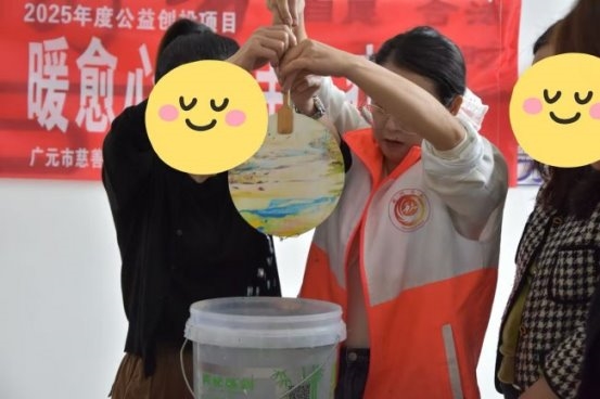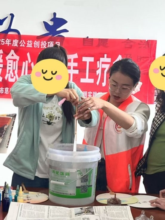 制作环节中,精康人员家属们兴致盎然、静心创作,手握画笔,搭配缤纷颜料,根据自己的喜好随心勾勒、点缀团扇。每个人专注投入,沉浸在手工创作的乐趣之中。针对部分动手能力较弱、性格内向的特殊精康人员家属,工作人员一对一耐心指导、温柔鼓励,陪伴精康人员家属完成专属漆扇作品。