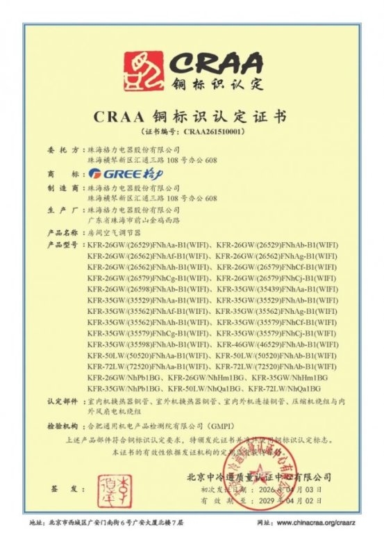 格力拿下的全国首张“CRAA铜标识认证证书”,意味着它是行业内第一个通过最严格实物检测、被官方盖章确认“真铜实料”的品牌。