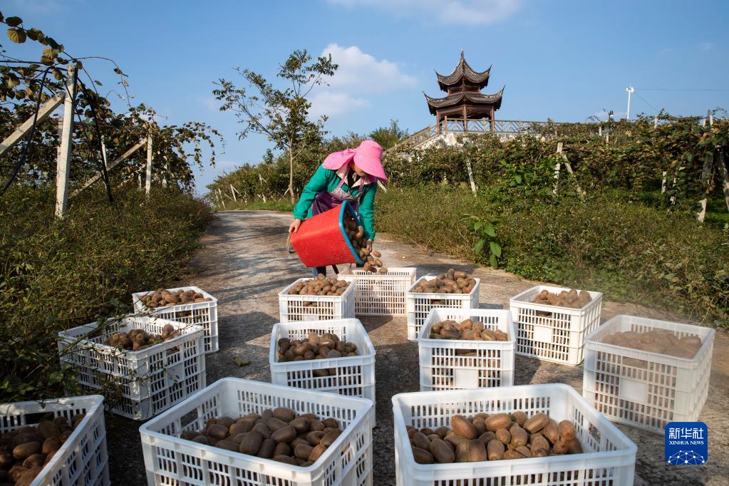 深秋时节,贵州省黔西市林泉镇海子社区生态农业园有机猕猴桃基地,当地村民忙着采收猕猴桃。近年来,黔西市通过村(社区)党支部领办合作社,采取“龙头企业+合作社+农户”的方式,规模化、标准化种植了4万多亩优质猕猴桃,优化产业结构,增加农民收入,助力乡村振兴。