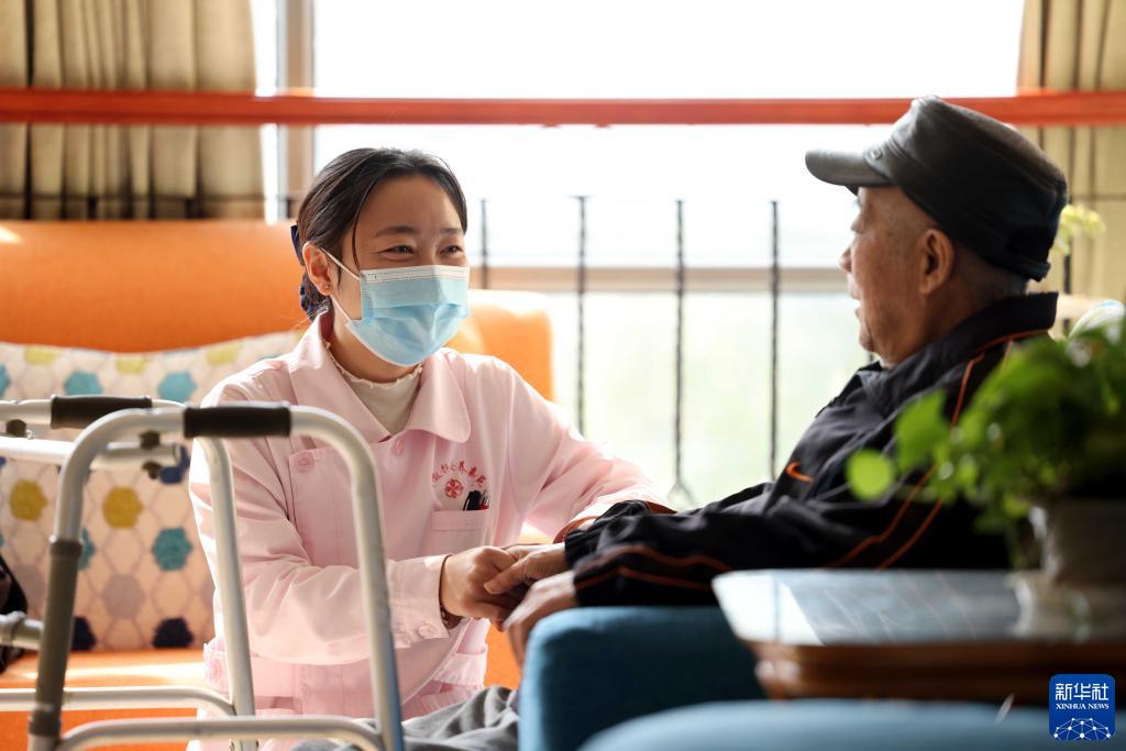 10月27日,在安徽省合肥市瑶海区静安养亲苑,护理人员在陪老人聊天。