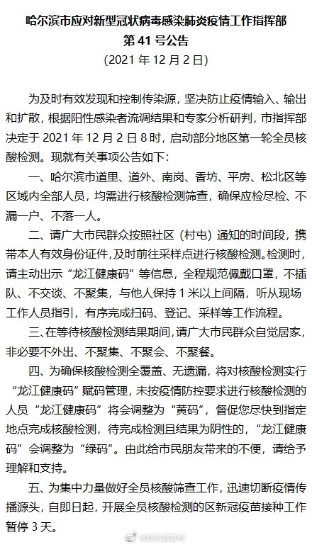 12月2日,@哈尔滨发布 公布哈尔滨市应对新型冠状病毒感染肺炎疫情工作指挥部第40号、41号公告。